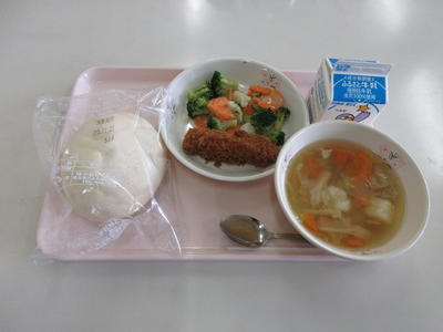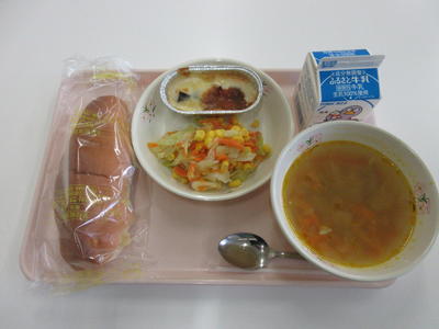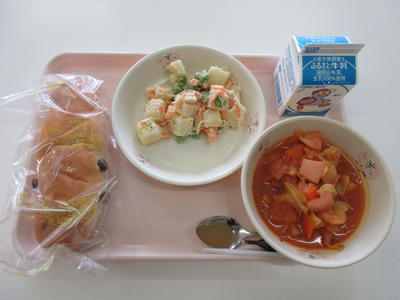 11月18日(水)ぶどうパン ボルシチ オリヴィエサラダ 牛乳(コーヒー飲料) 投稿: HP担当 (2020/11/18) 今年度の給食のテーマは「給食で世界を旅しよう」です。 今日はロシアの料理でした。 -