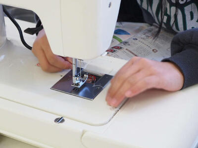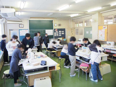 ミシンを使うことが初めての児童がほとんどです。教科書に載っているミシンの使い方をよく読んで、上糸を掛けたり、下糸を出したりしています。