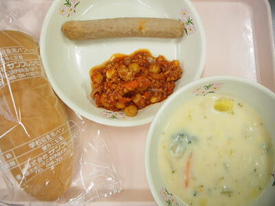 11月12日(水)コッペパン むさしのシチュー フランクフルトソーセージ チリコンカン 牛乳