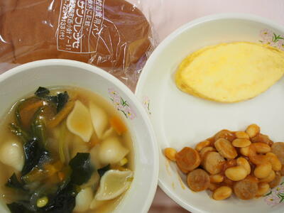 11月13日(木)黒パン マカロニスープ チーズオムレツ ウインナービーンズ 牛乳