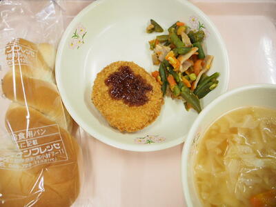 12月3日(水)ツイストパン 野菜スープ メンチカツ いんげんとベーコンのソテー 牛乳
