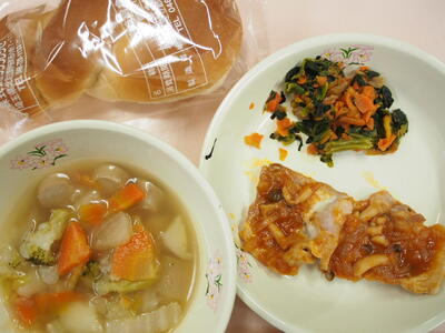 1月29日(木)ツイストパン 冬野菜のポトフ 豚肉のトマトソースがけ 青菜のソテー 牛乳