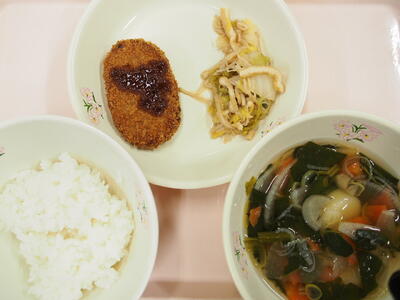 2月16日(月)ごはん いも団子汁 メンチカツ 白菜とえのきの煮浸し 牛乳