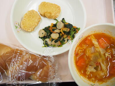 2月25日(水)ツイストパン ミネストローネ チキンナゲット ほうれん草とウインナーのソテー 牛乳