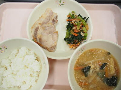 3月2日(月)ごはん 切り干し大根のごまみそ汁 豚肉のしょうが焼き こまツナサラダ 牛乳