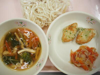 3月6日(金)菜の花うどん 笹かまぼこの磯辺揚げ 煮浸し 牛乳