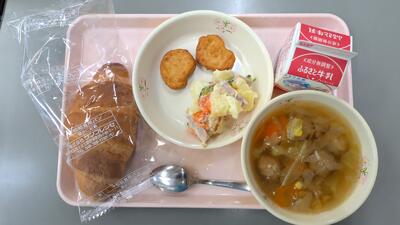 令和8年4月28日(火)クロワッサン・牛乳・春キャベツと肉団子のスープ・チキンナゲット・ポテトサラダ