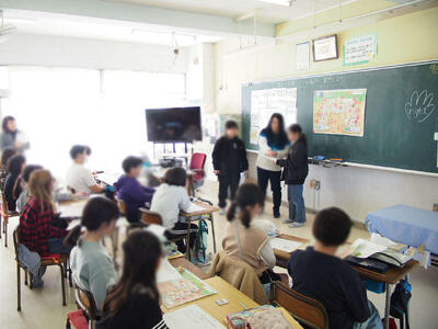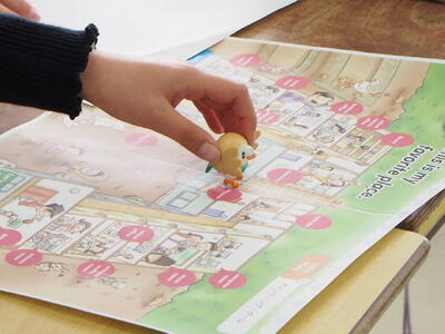 学校の中のお気に入りの場所へ行く道順を英語で案内しています。