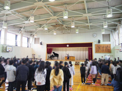 全校児童が集まり、校歌を歌っています。